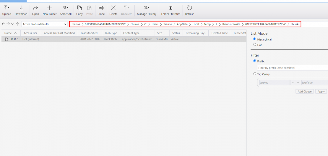 Thanos has a built in tool to rewrite these blobs and remove the metric we wanted, which seemed easy enough to do, but we had no idea when the problem first started, so I had to analyze, rewrite and upload all the data. It all seemed to work fine, util I discovered no metrics where available. It turned out that the tool I used inherited my local path and uploaded all the modified data to <guid>/chunks/c:/users/appdata/local/[...]/00001.blob